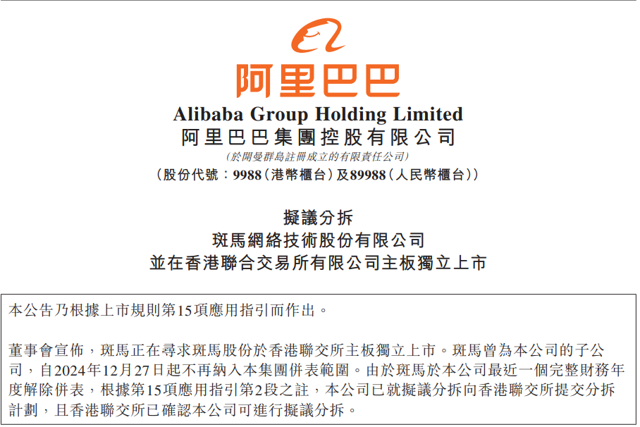 8月21日,阿里巴巴集团在香港联交所公告,拟议分拆斑马网络技术股份有限公司,并在香港联合交易所有限公司主板独立上市。