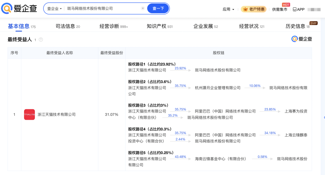 爱企查App显示,斑马智行关联公司斑马网络技术股份有限公司成立于2015年11月,法定代表人为张建锋,注册资本约32亿元人民币。值得一提的是,该公司最终受益人为浙江天猫技术有限公司,最终受益股份为31.07%。