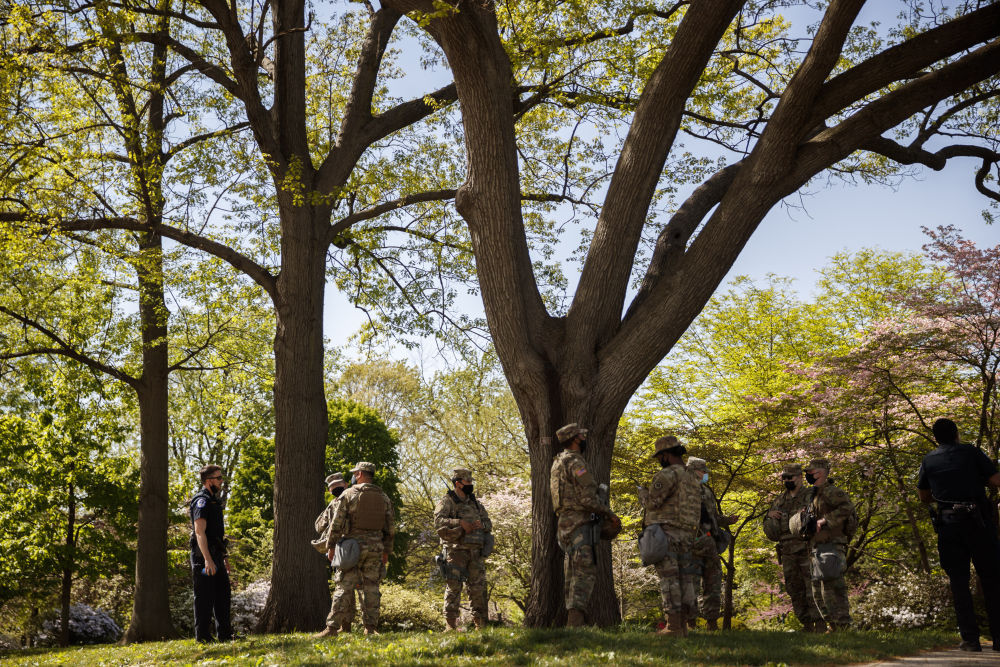 2021年4月20日,在美国首都华盛顿特区,国民警卫队成员在国会附近警戒。新华社发(沈霆摄)