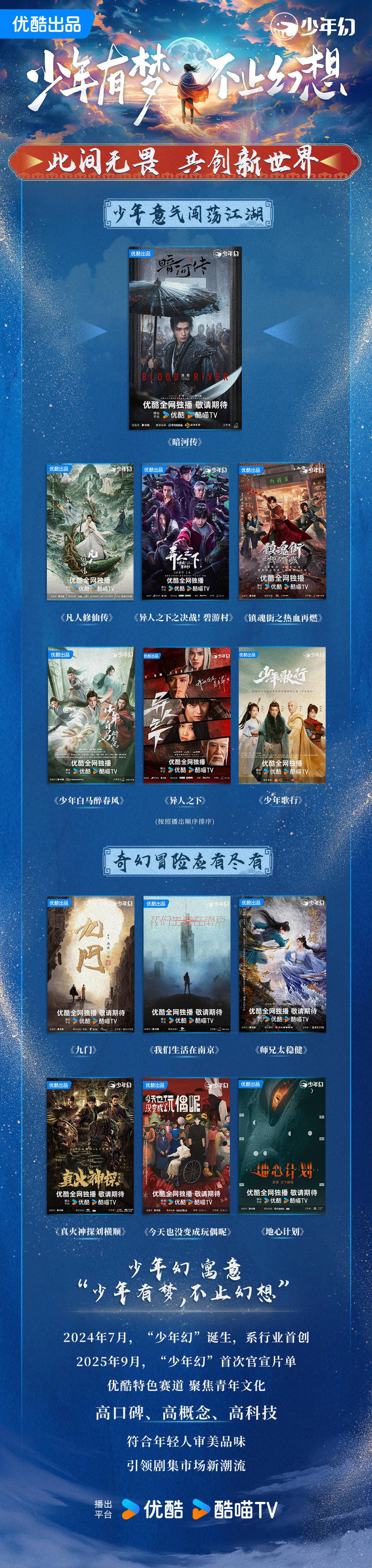 作为优酷特色赛道金策宝,“少年幻”聚焦青年文化,以真人漫改、系列化IP、剧漫联动、先进技术为坐标系,致力于打造“高口碑、高概念、高科技”的作品,符合年轻人审美品味,引领剧集市场新潮流。“少年幻”寓意“少年有梦,不止幻想”,于2024年7月官宣,系行业首创;2025年9月,“少年幻”首次发布片单,涵盖少年新武侠、都市奇幻、末日科幻、热血冒险四大品类。目前已播出的系列化IP为“周木楠少年江湖系列”“异人之下系列”“镇魂街系列”。